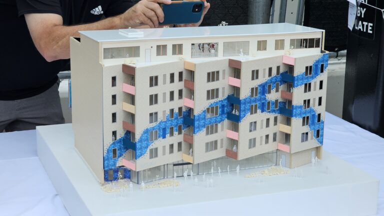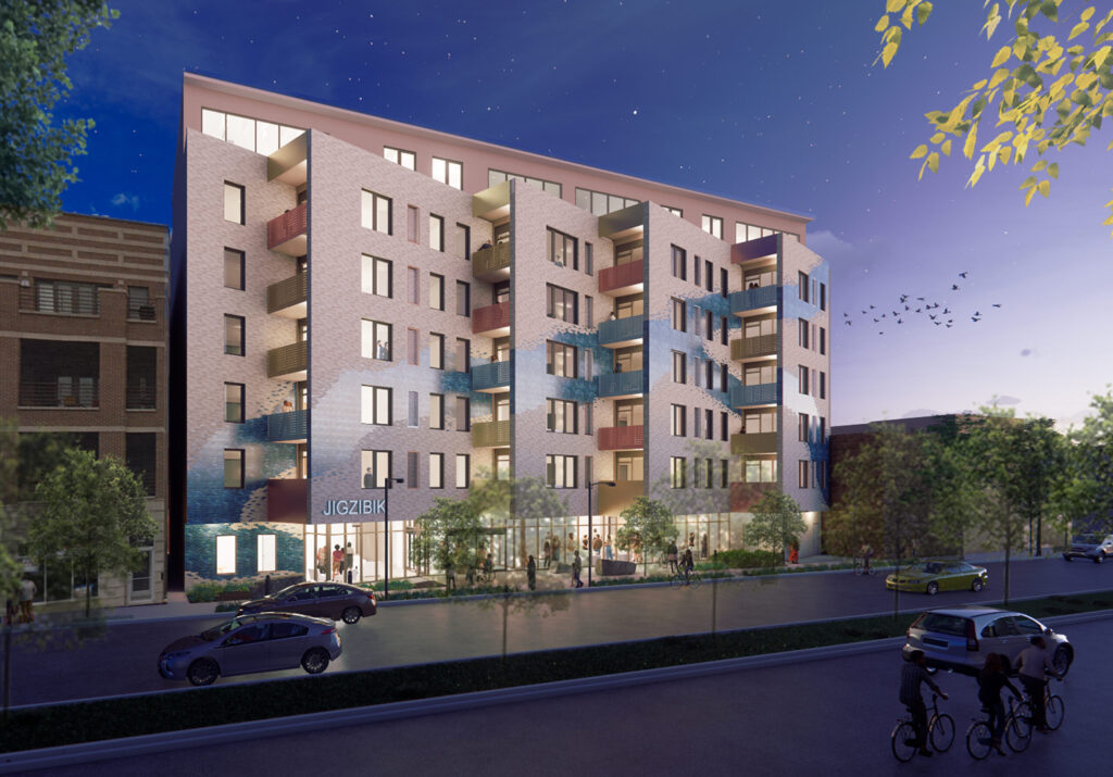 Named Jigzibik, a Potawatomi word meaning “at the river’s edge,” the building was titled by the project’s Native American Advisory Council and pays homage to the Great Lakes Indigenous nations. Its design will reflect themes of environmental stewardship, cultural heritage, and intergenerational connection, including a custom masonry façade accented by a flowing river motif rendered in white and blue brick.
