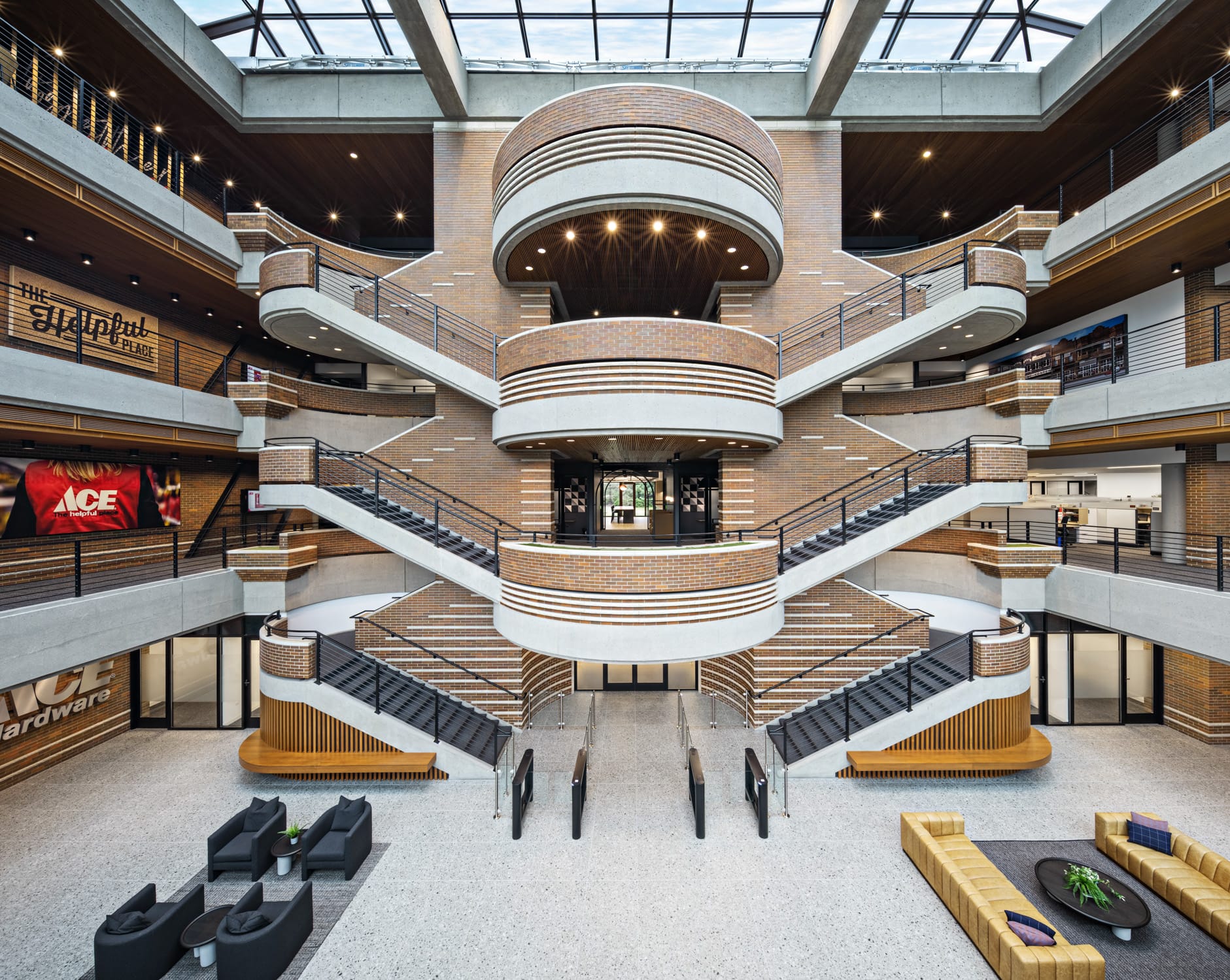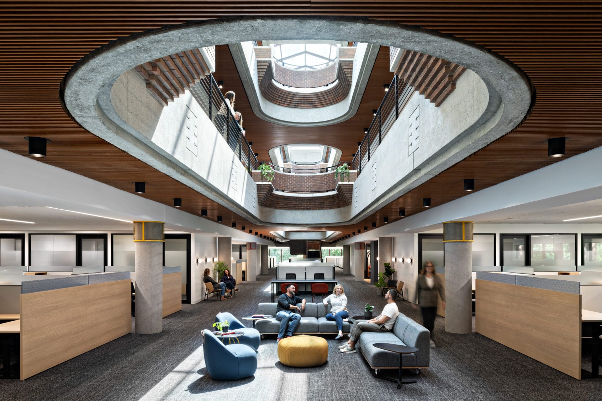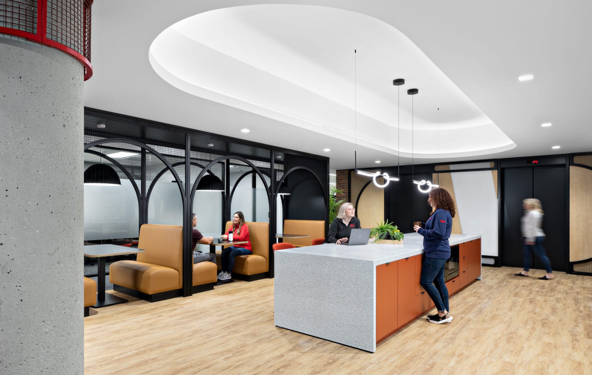 The renovation repurposed many of the main building’s original architectural elements, including a large center atrium and skywells that allow ample natural light to flow throughout the space. Skender utilized the existing six-inch raised-floor system for all electrical and low-voltage infrastructure, which kept the open areas clear. To combat external supply chain challenges, Skender leveraged flexible phasing and work sequencing to further streamline the construction schedule for on-time and on-budget delivery.