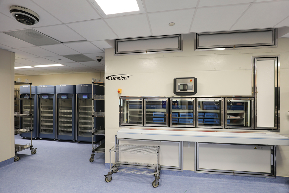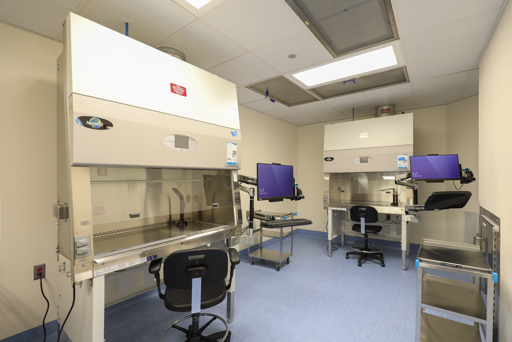 The sterile pharmacy allows for the safe preparation, mixing and packaging of drugs. The project also includes 17 mixing hoods, refrigerated and non-refrigerated drug storage, and an interlocked ante-room.
