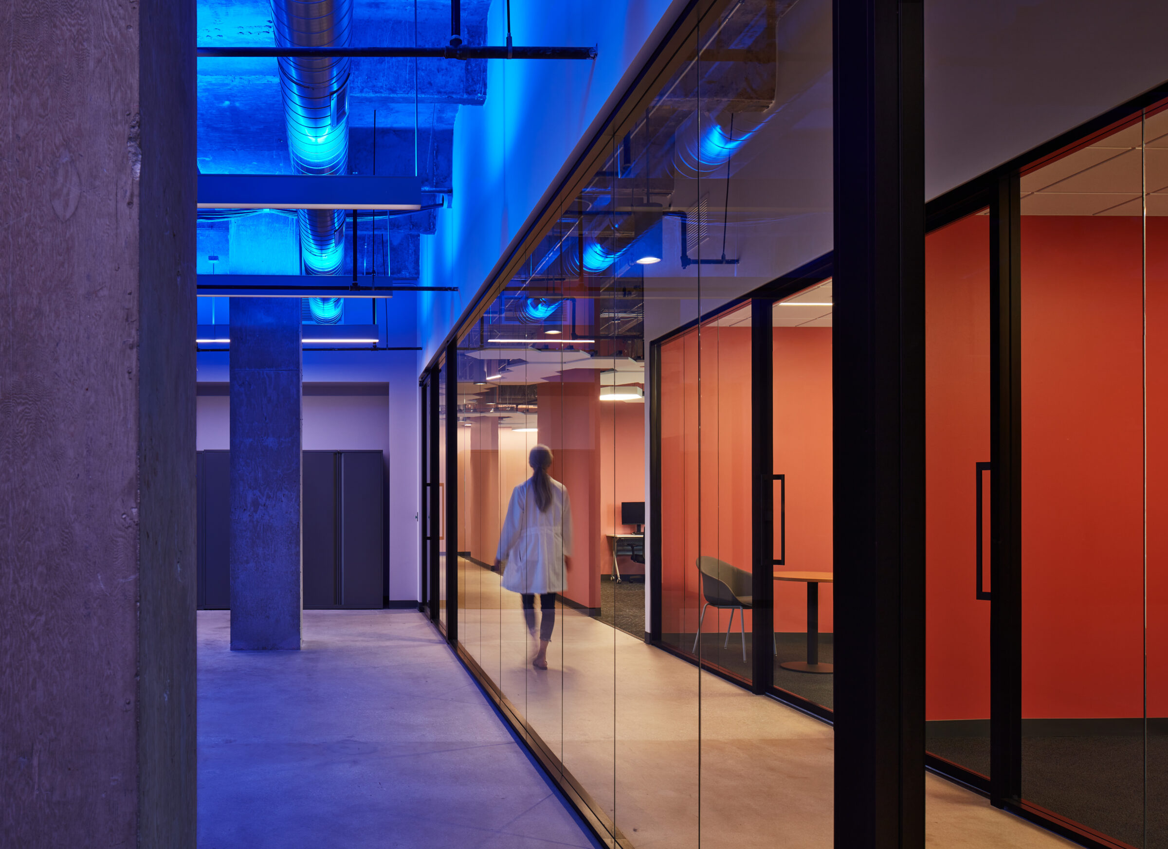 The full-floor workspace features 44 lab stations, 11 fume hoods, two tissue culture rooms with alarming pressurization, an uninterrupted power supply and an automation room for controlled testing.
