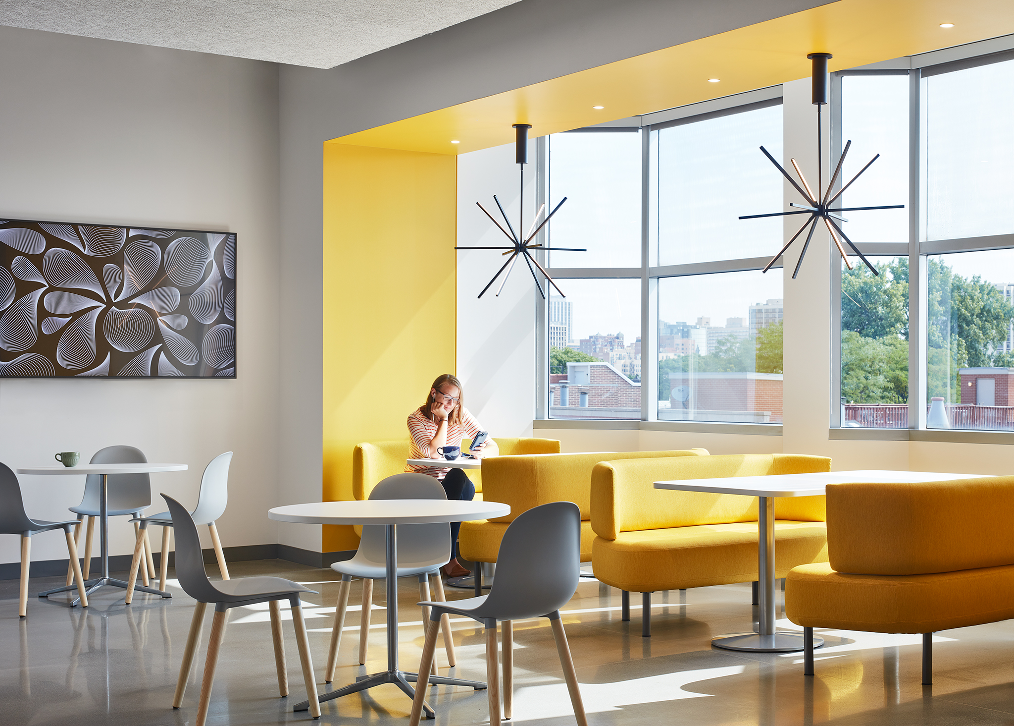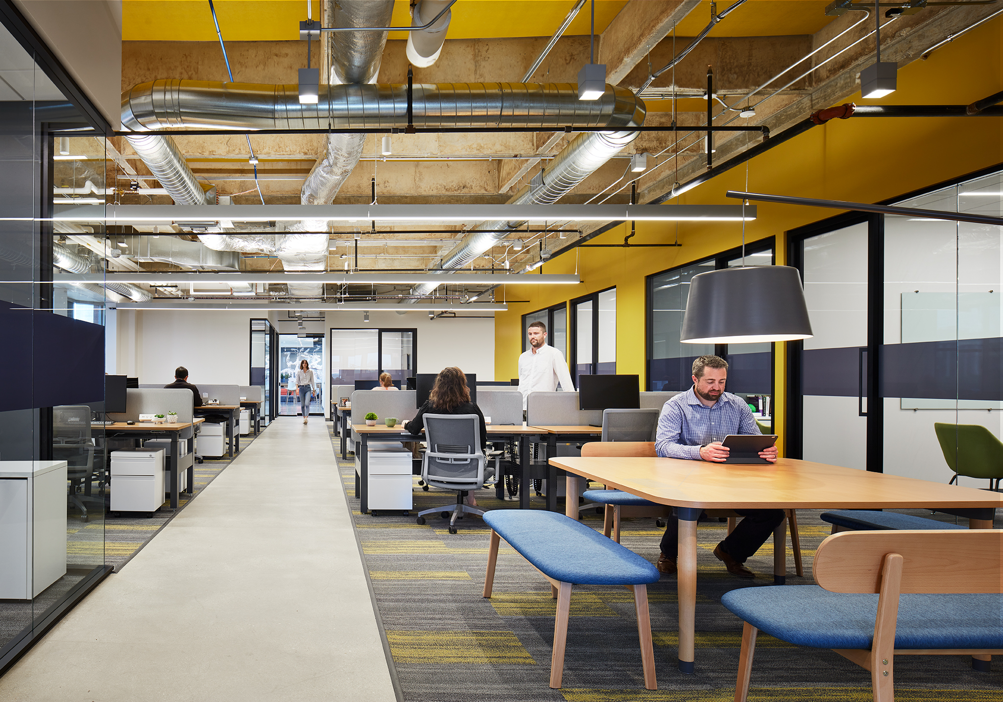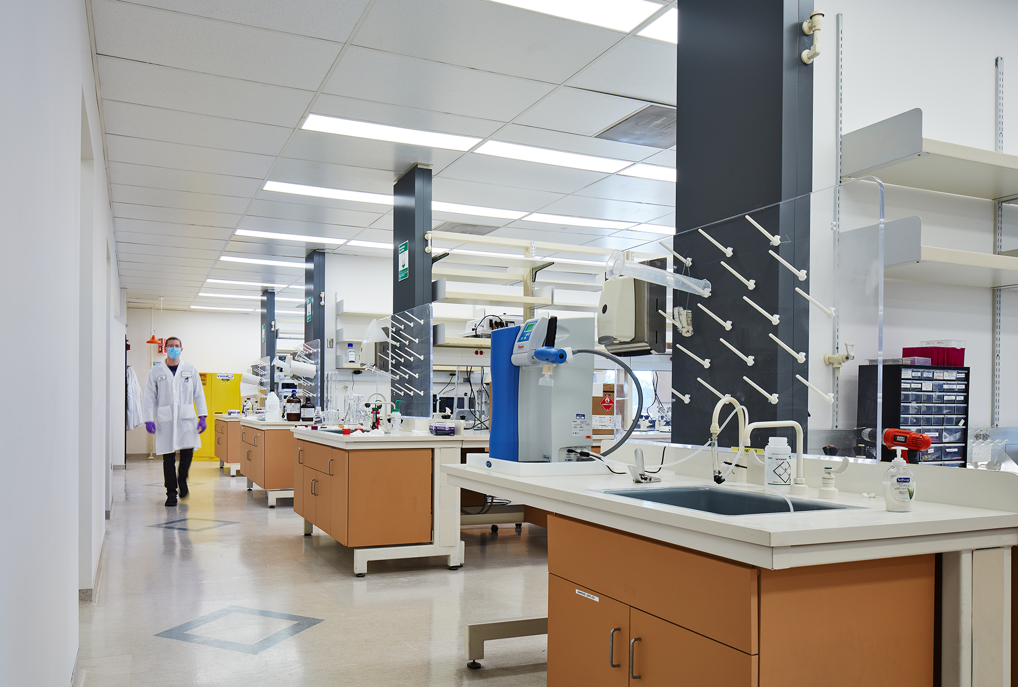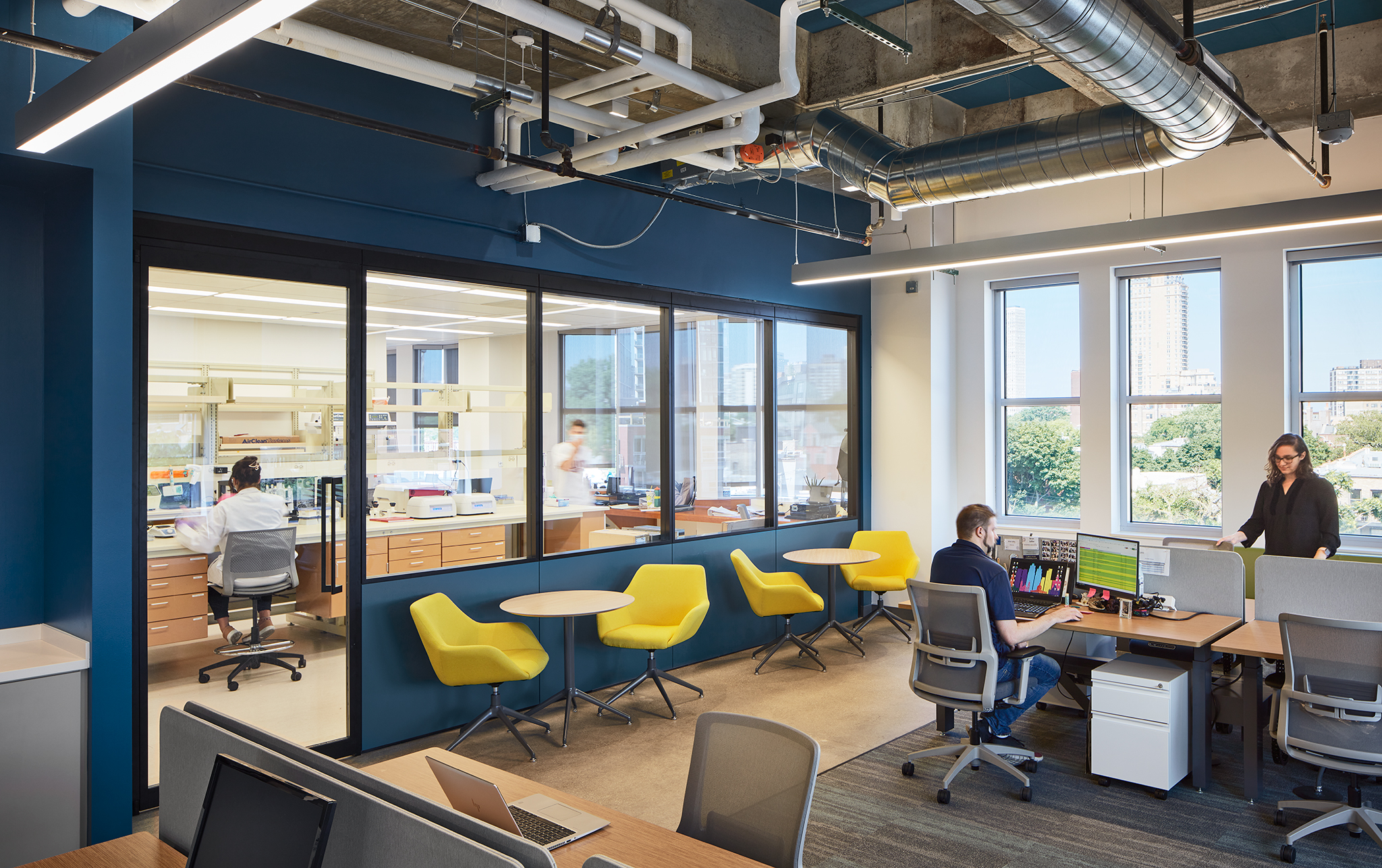 Occupying an entire floor, Exicure’s workspace features 44 lab stations, 11 fume hoods, open-office workstations, two tissue culture rooms with alarmed pressurization, an uninterrupted power supply, and space adapted for a custom-built DNA synthesizer machine. Utility upgrades included the addition of HVAC dampers to the exhaust system, converting pneumatic controls to DDC, and installing an uninterrupted power supply unit for specialty equipment.