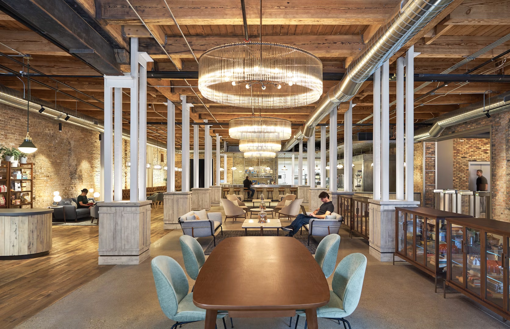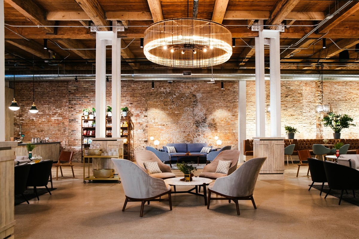 The dynamic space features a custom curved bar, exposed brick walls, wood beam ceilings, handcrafted glass light fixtures, and a one-of-a-kind mural made of found construction materials depicting a city street scene with Cadbury trolley cars.