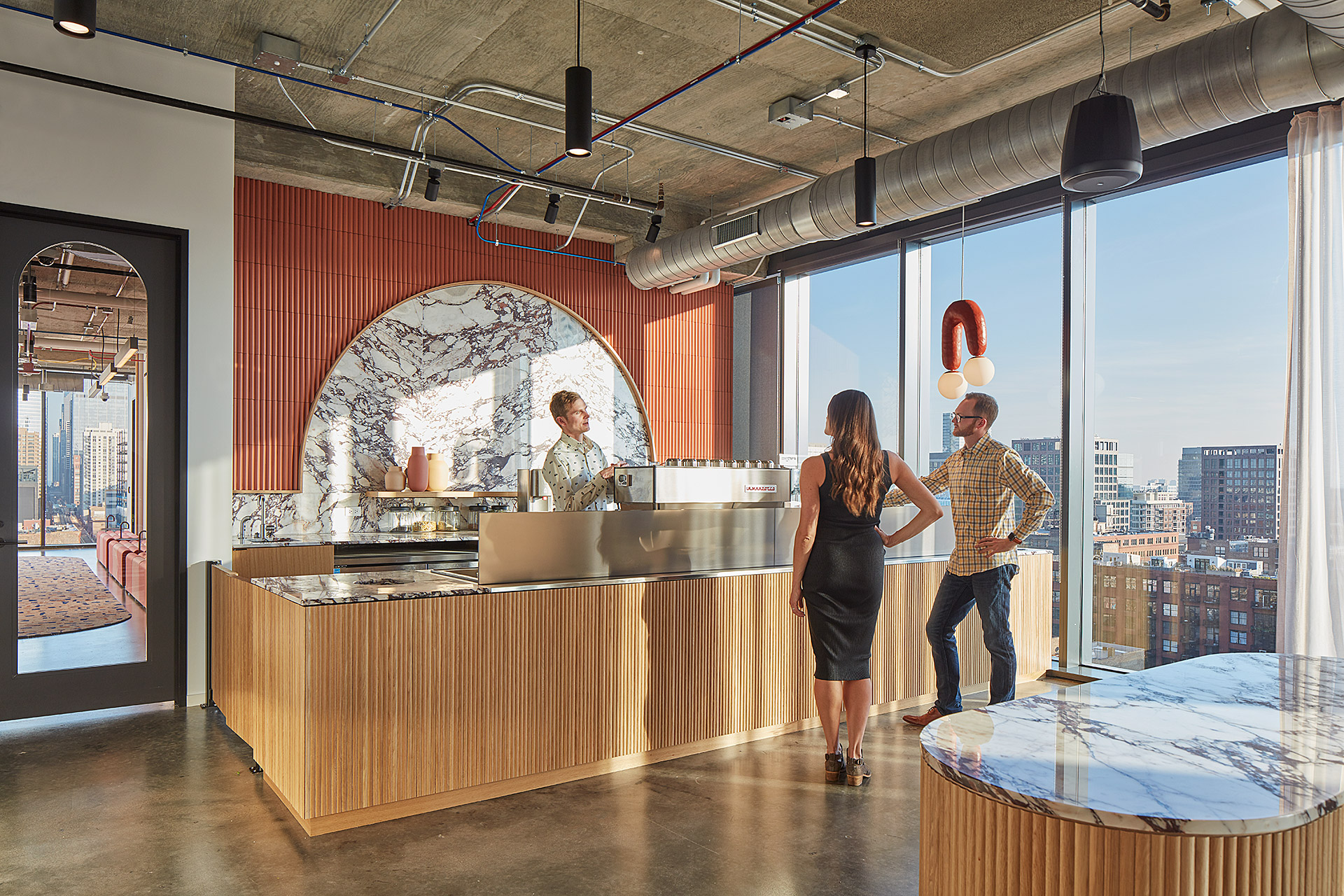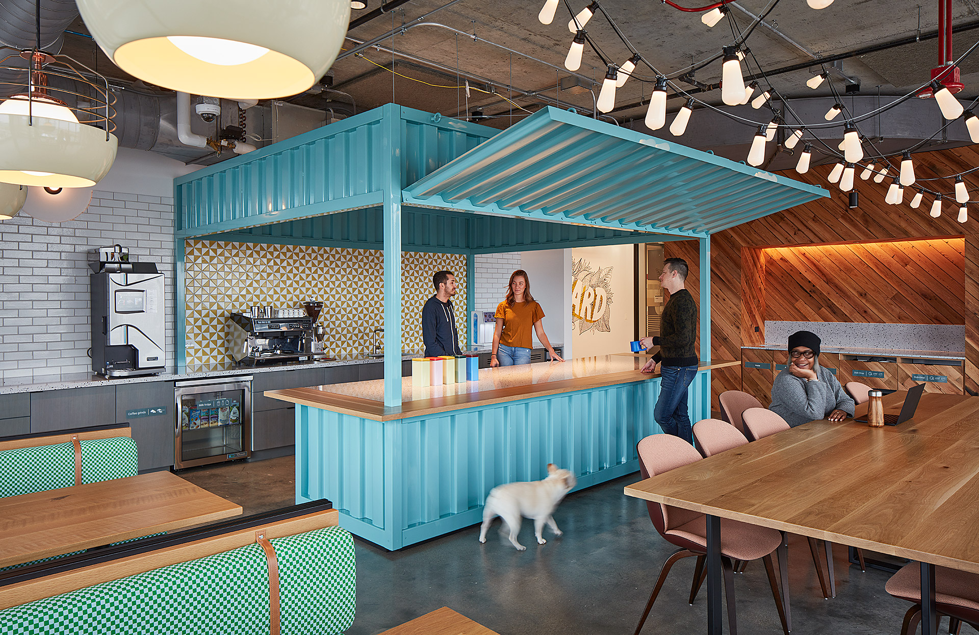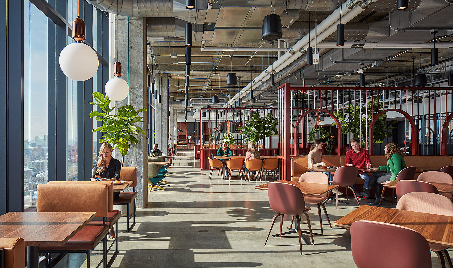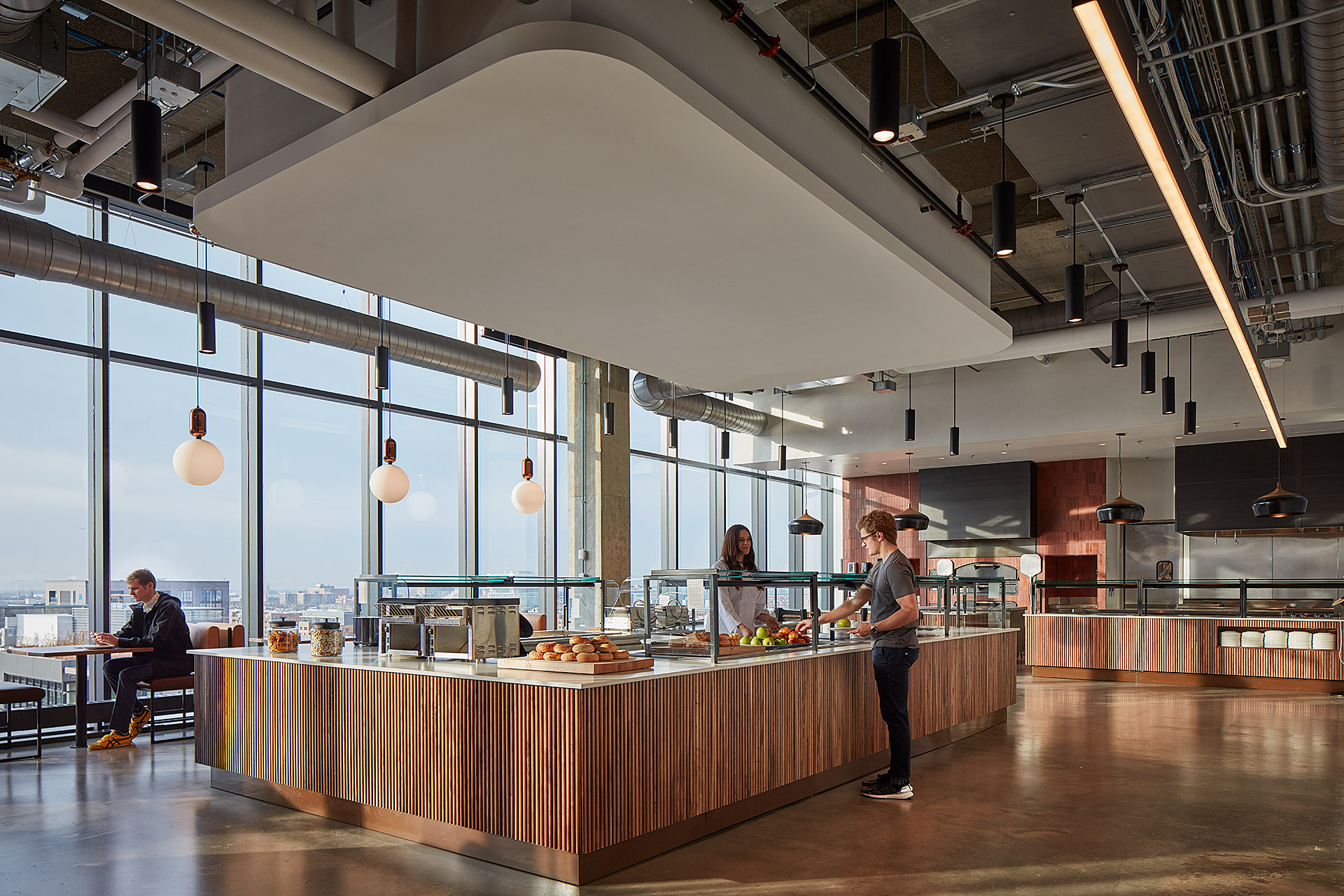 It features a commercial cafeteria, multiple micro kitchens, a conferencing and training floor, a connecting stair, open office workstations, huddle rooms and private workspaces.