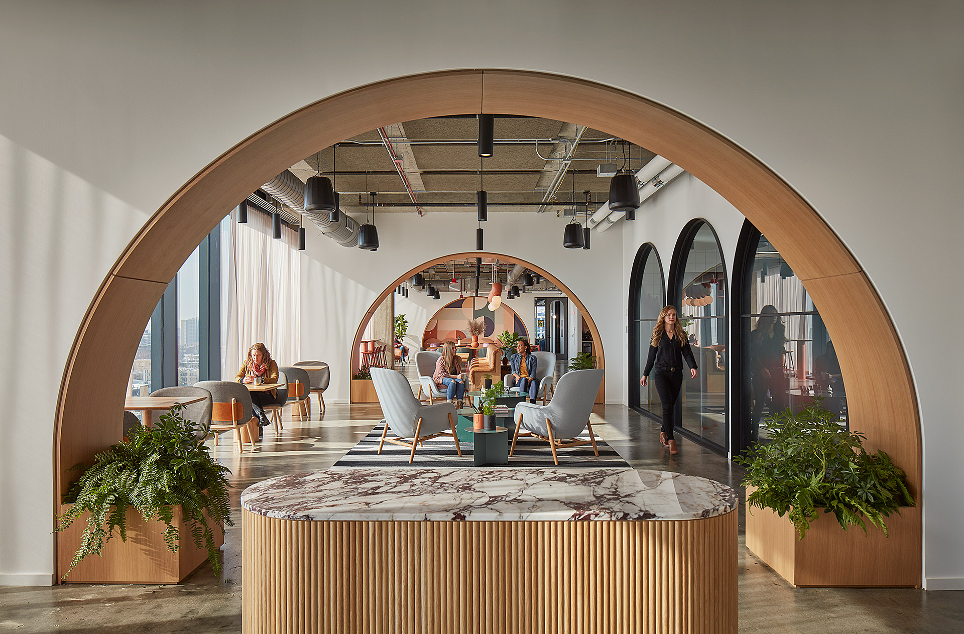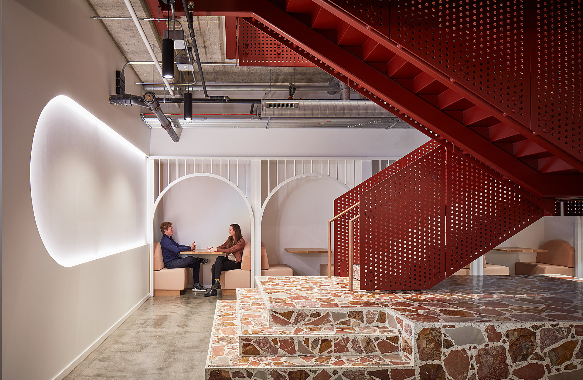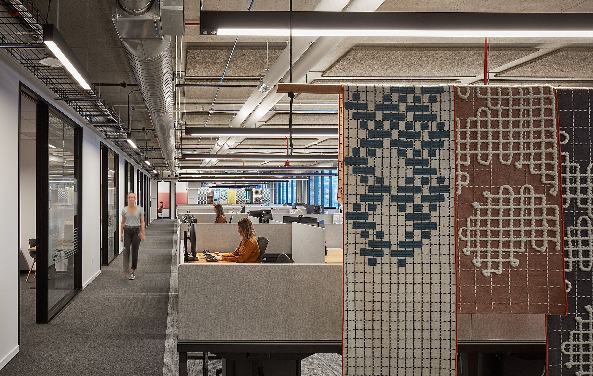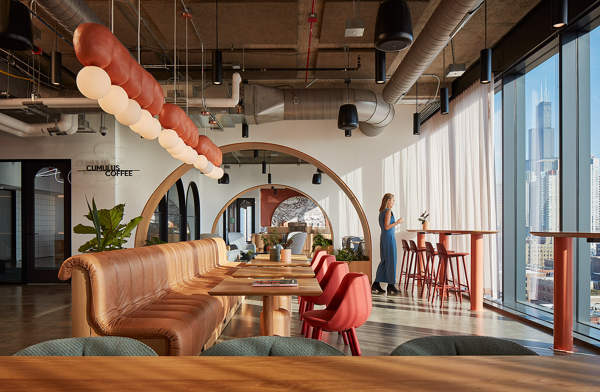 It features a commercial cafeteria, multiple micro kitchens, a conferencing and training floor, a connecting stair, open office workstations, huddle rooms and private workspaces.