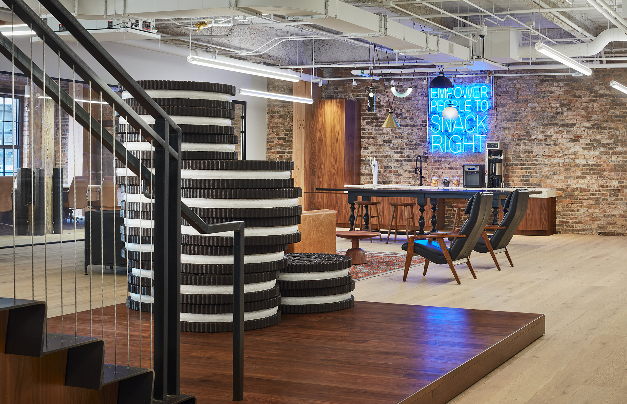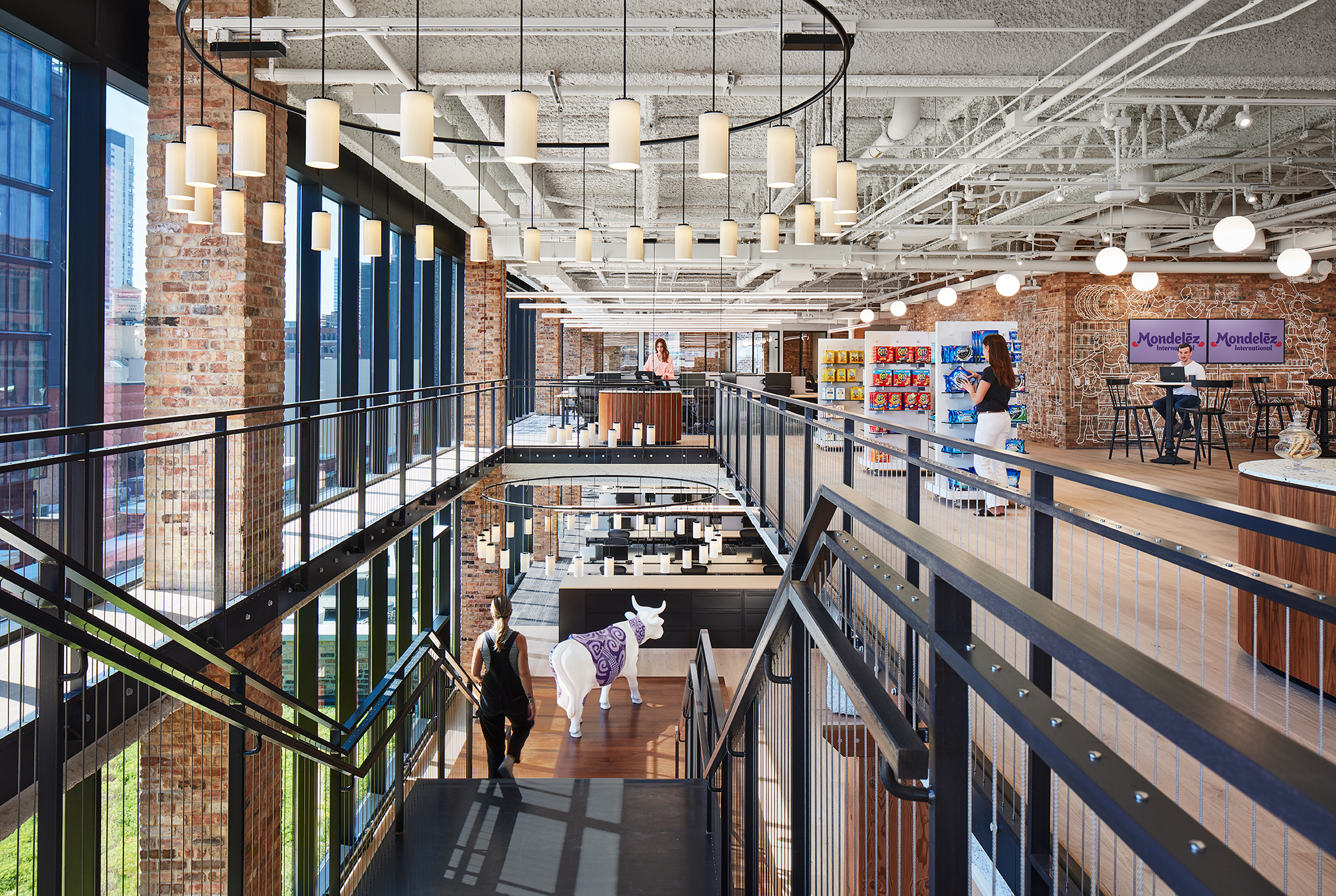 Mondelez, a global leader in snacking, relocated its suburban headquarters to this space which features two connecting stairwells, dynamic company branding, open-office workstations, private offices, a wide range of conference rooms and two large outdoor terraces.