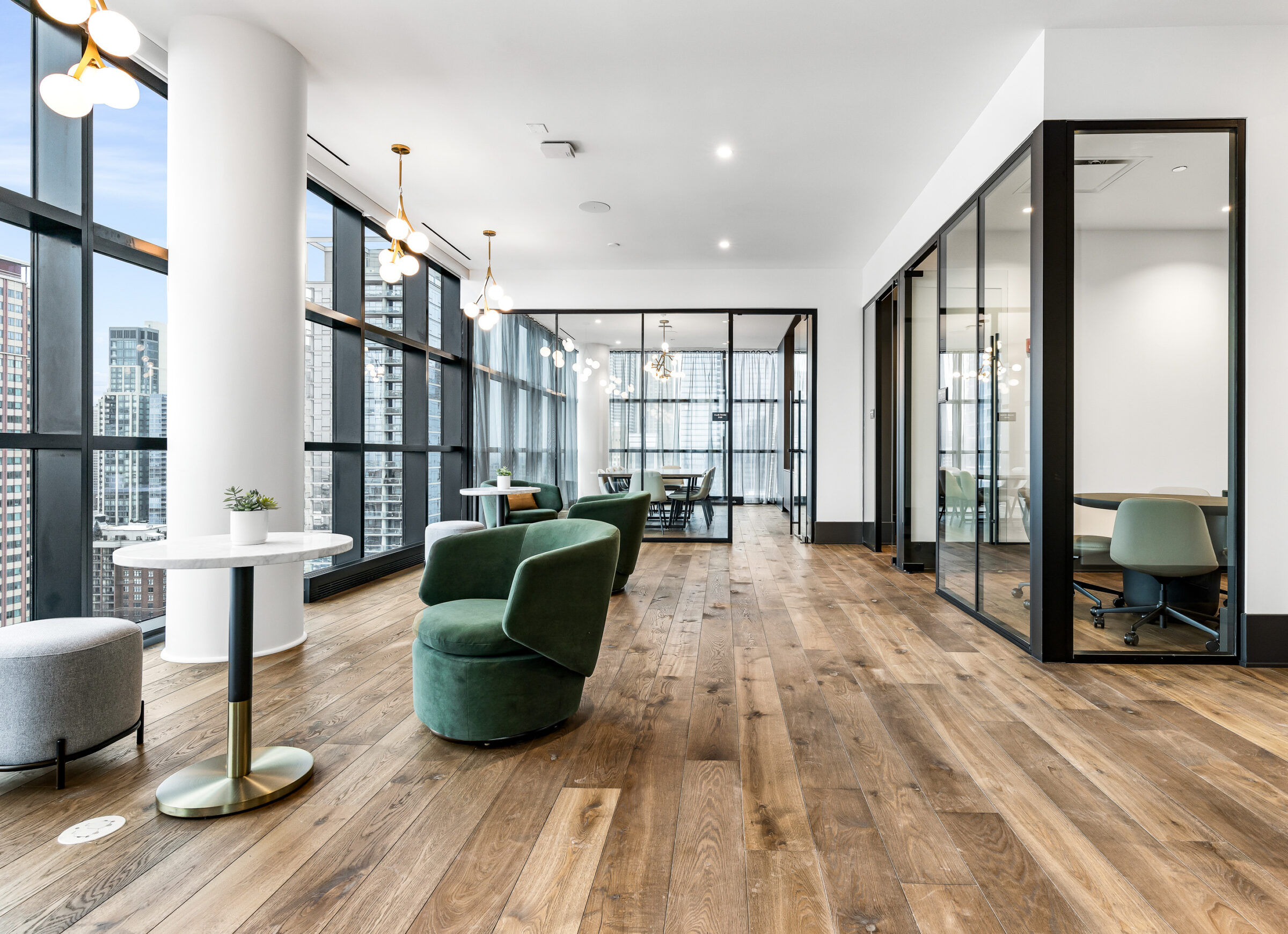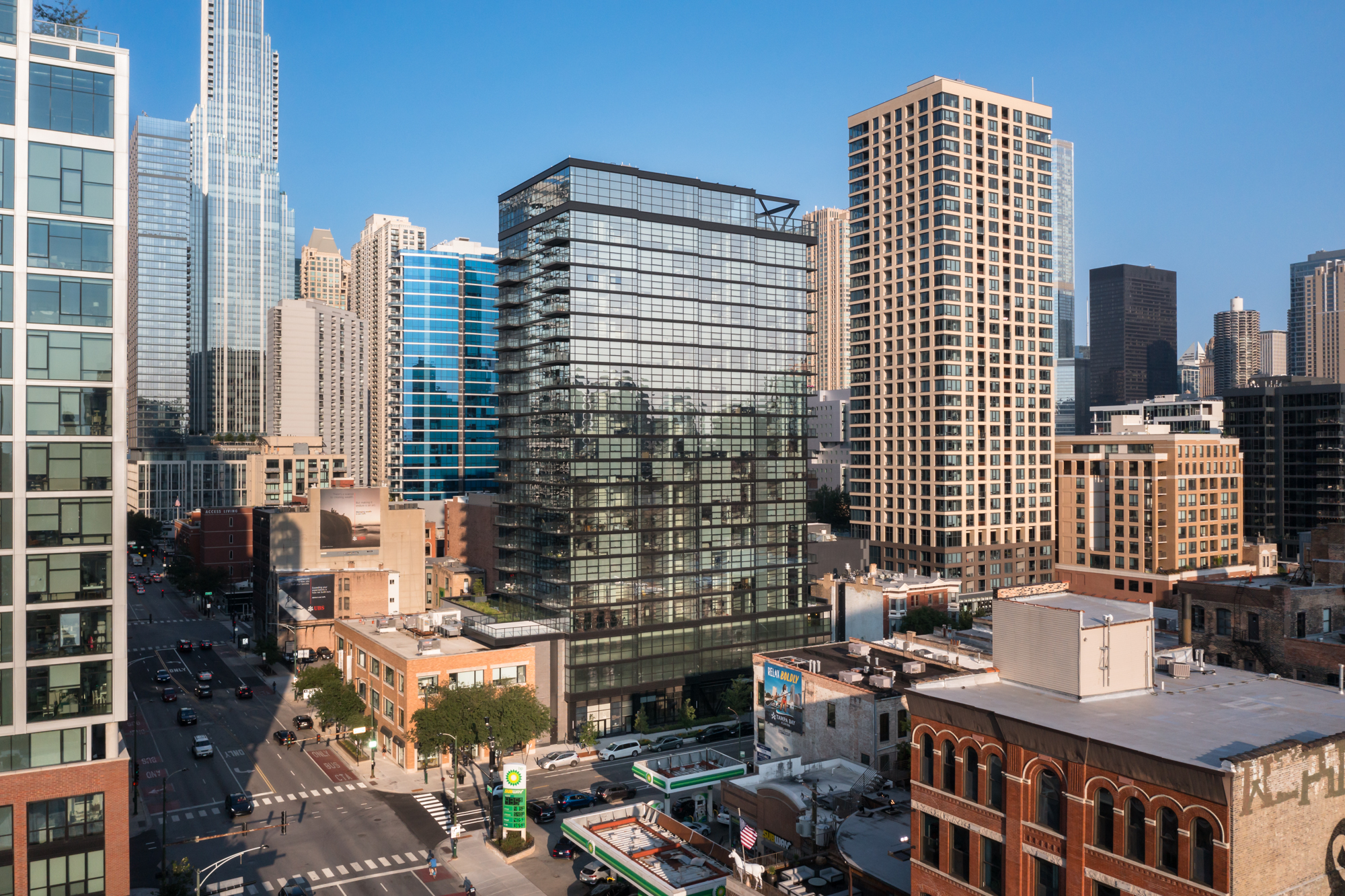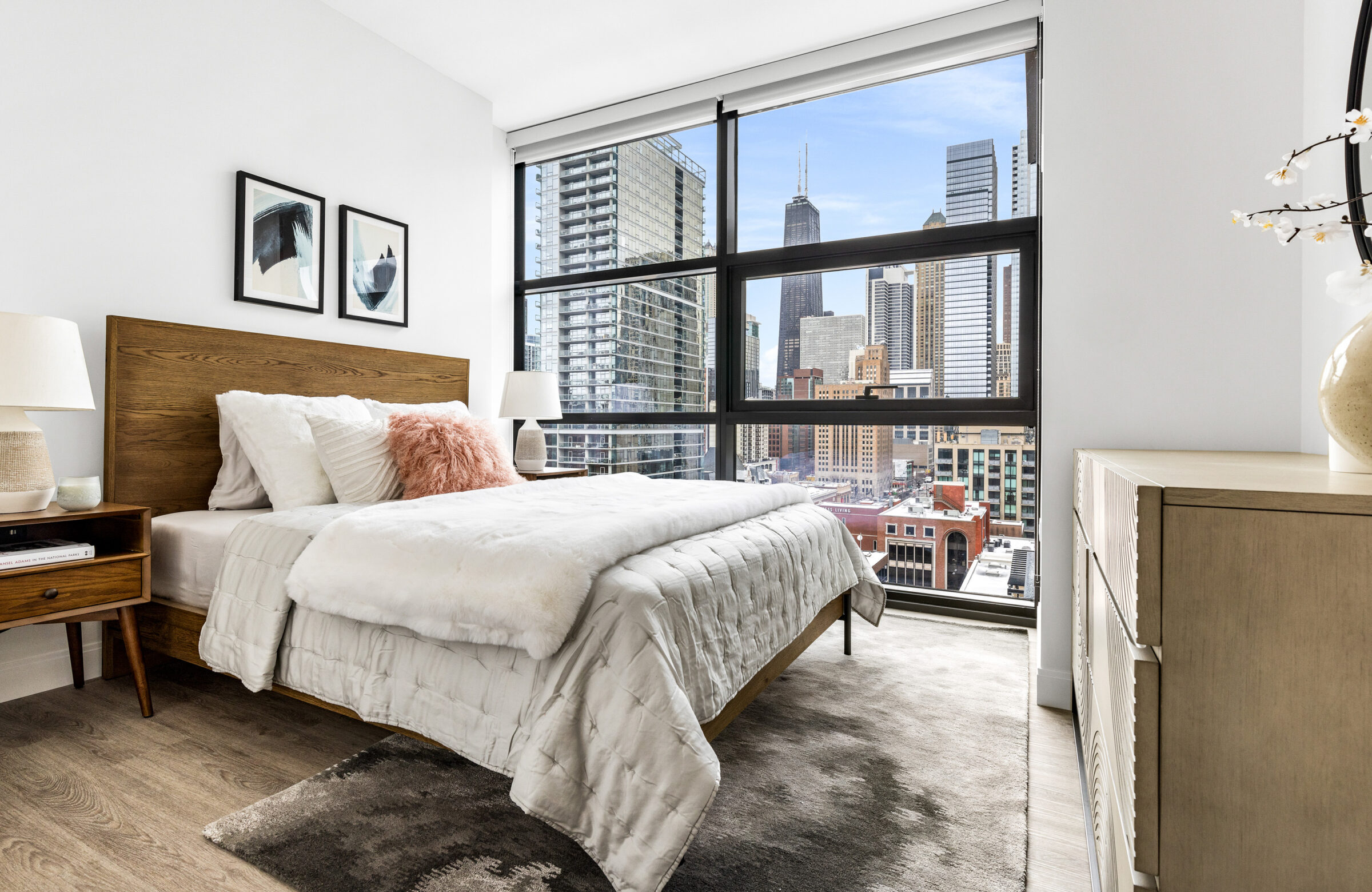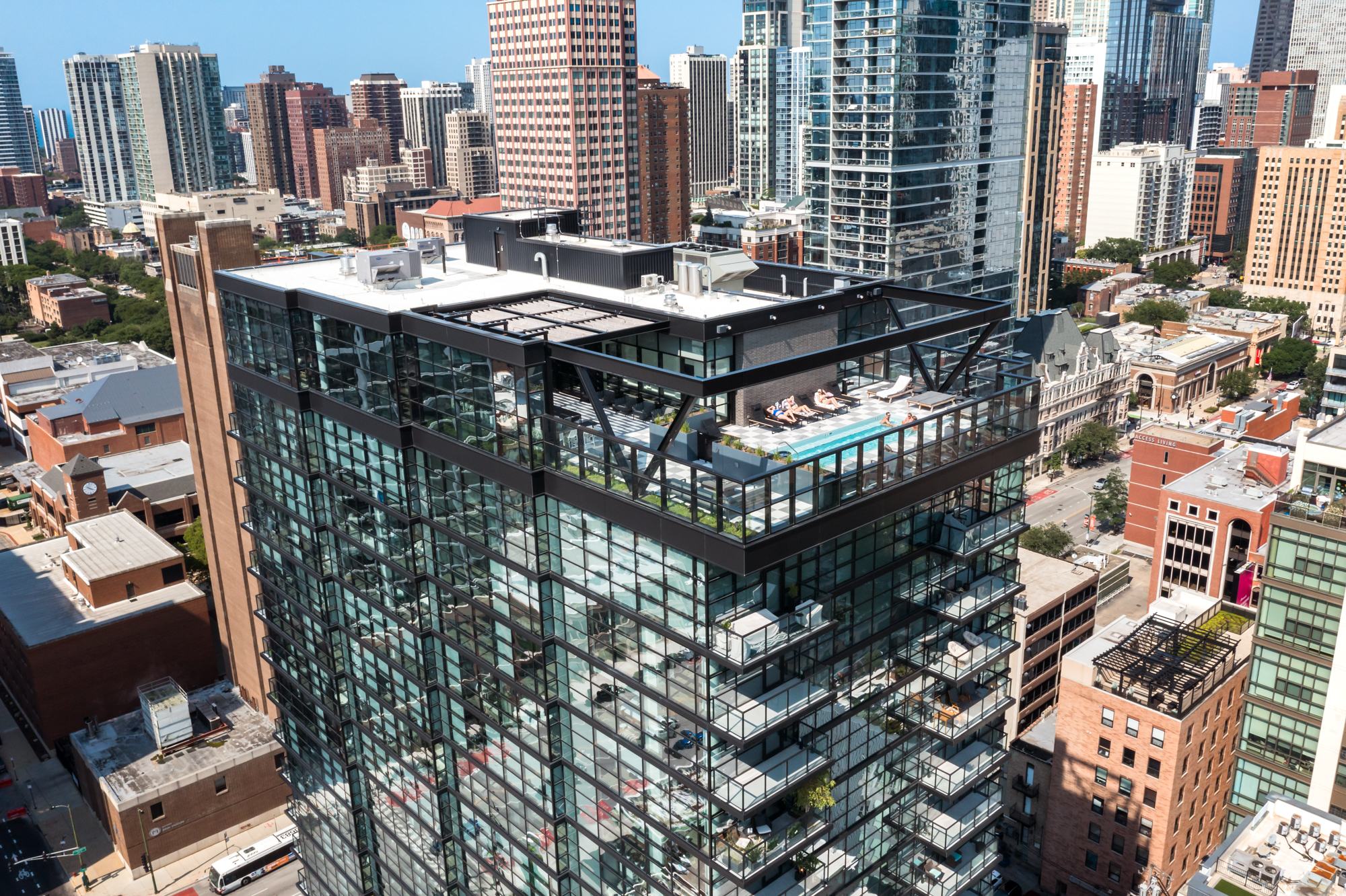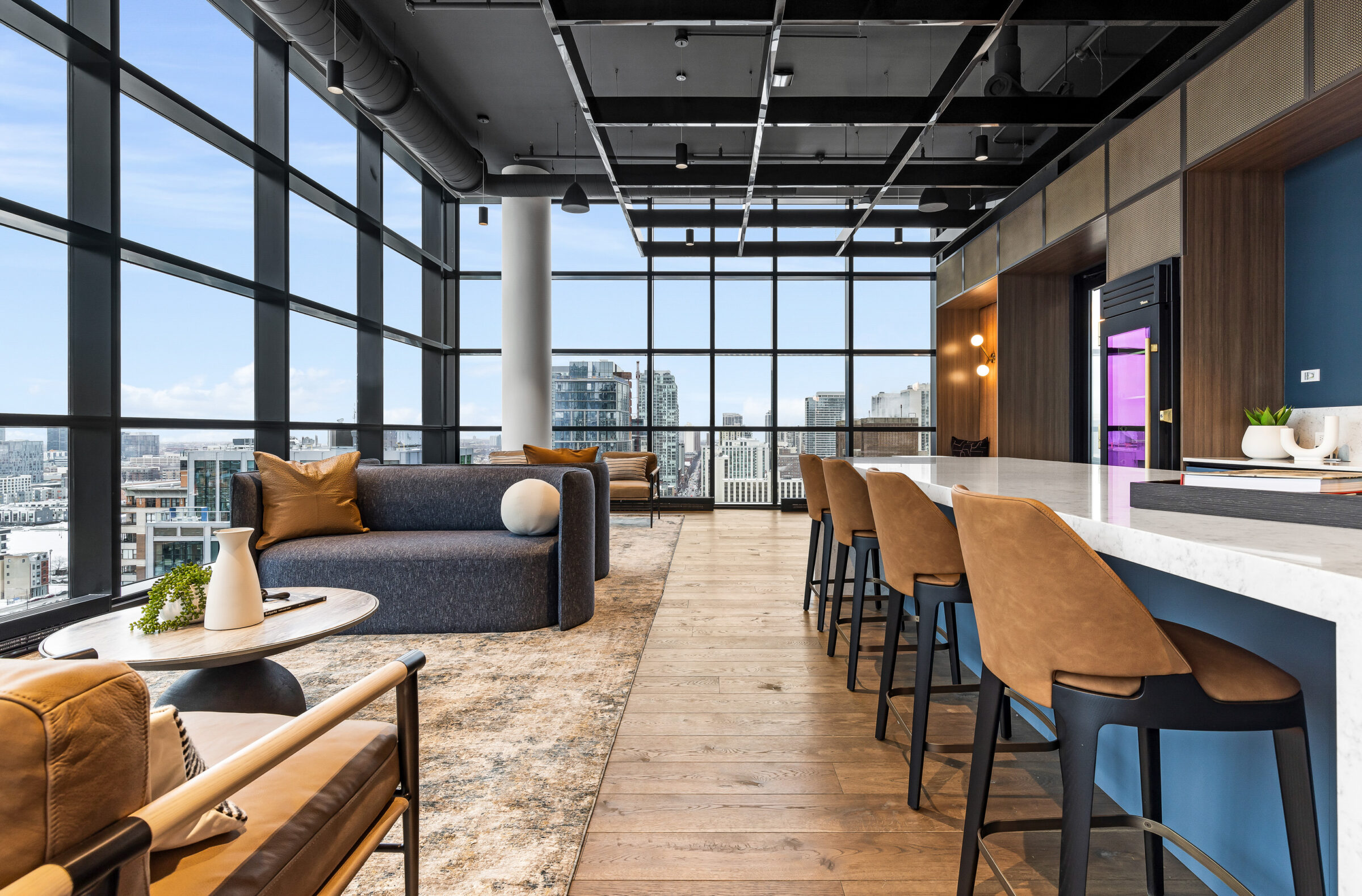 Property amenities include an in-gym yoga studio, an outdoor pool with lounge area, a rooftop deck complete with a fire pit and grills, a kitchen café and a group fitness terrace. Residents also have access to a private meeting and events room, an elegant lobby entrance, a dog run and spa, EV charging stations, dedicated parking and a bike room. This elegant property blends luxurious living with the vibrant energy of River North.