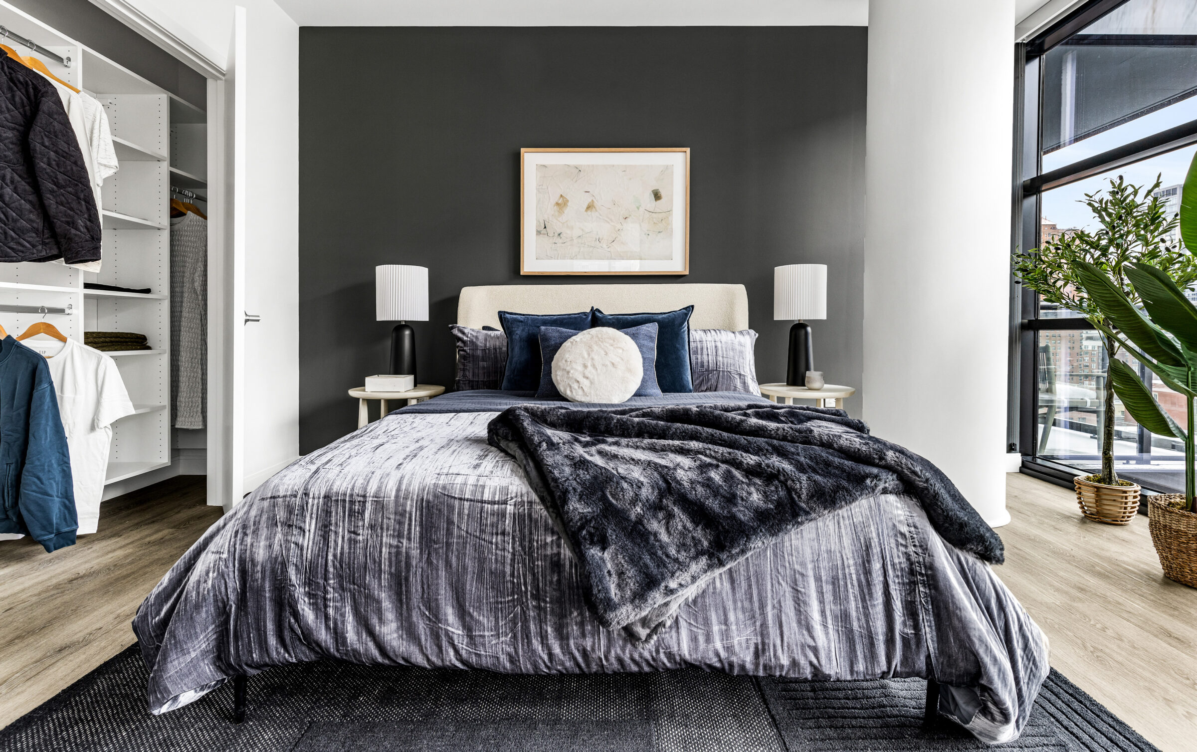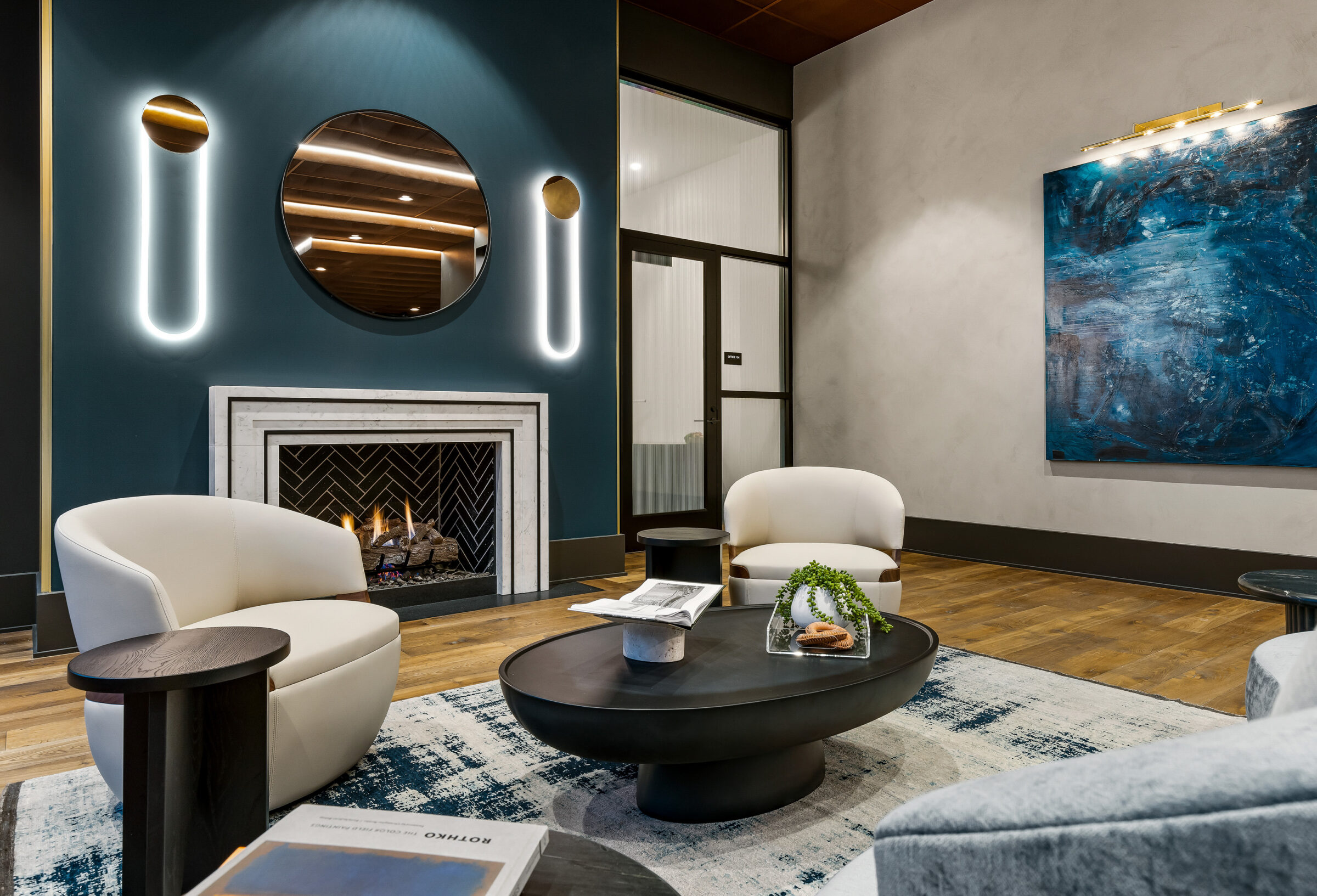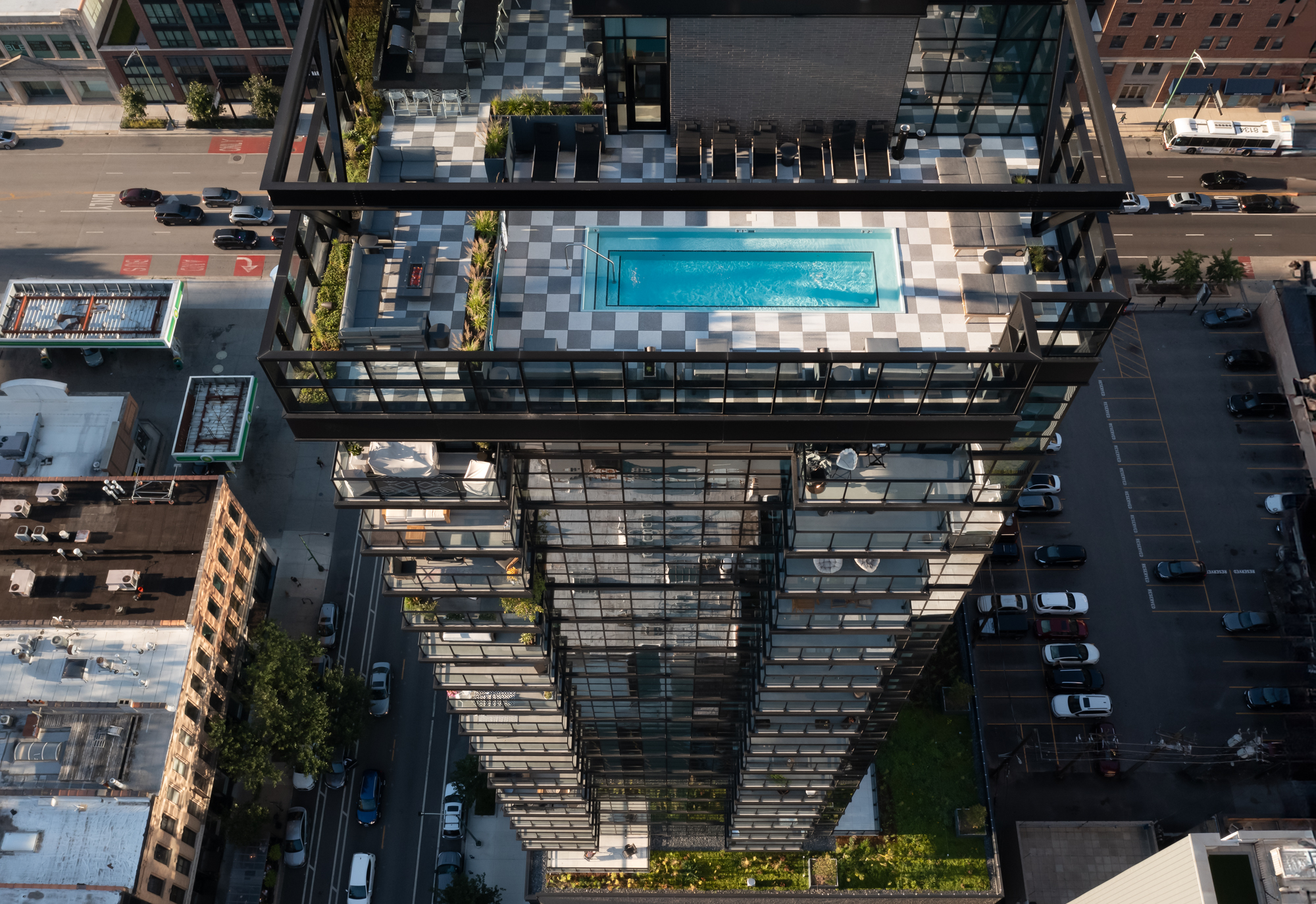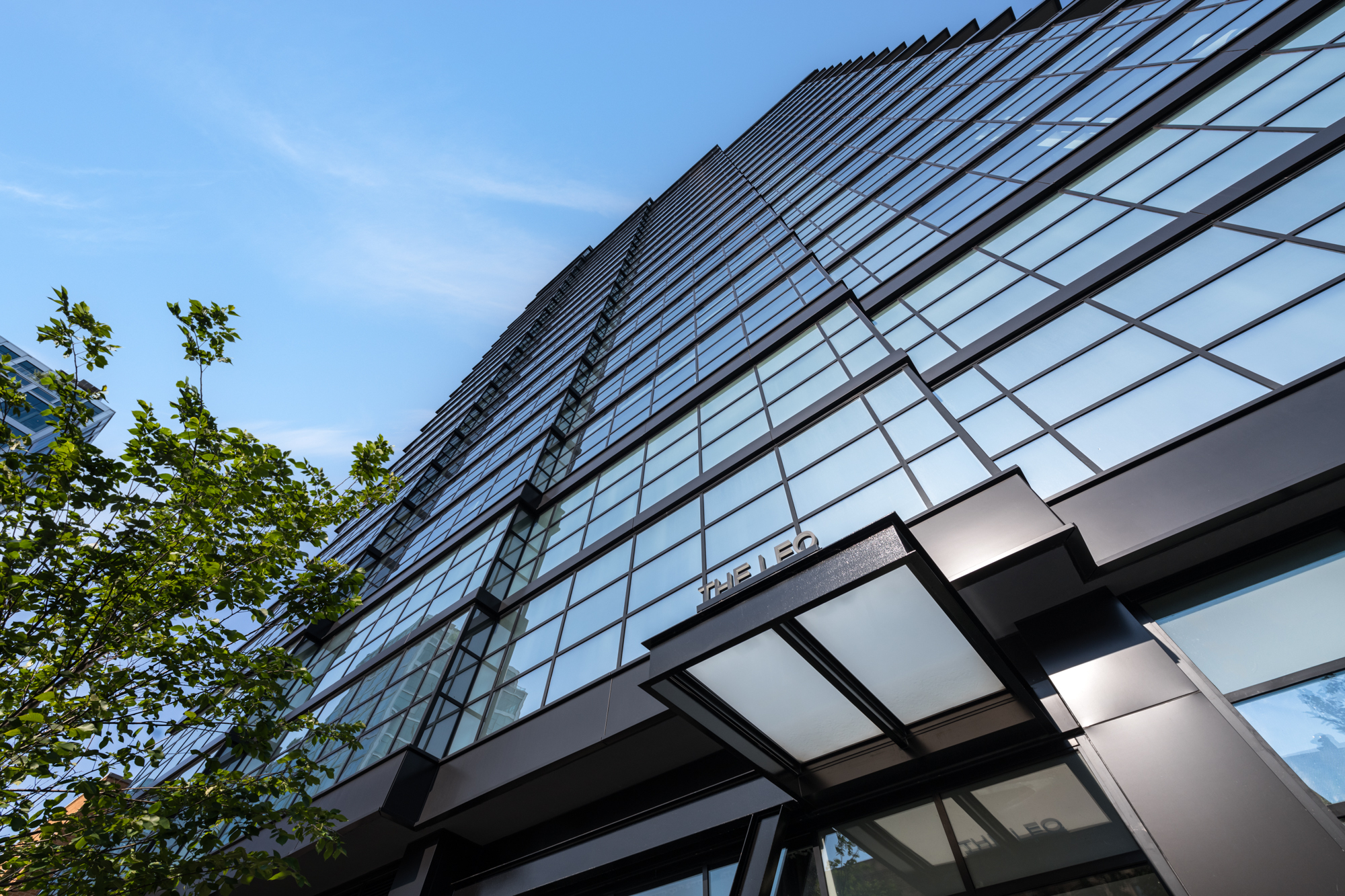 The Leo’s apartments have luxury features, including floor-to-ceiling windows with sweeping downtown views, state-of-the-art kitchen appliances, in-unit laundry, private balconies, and expansive nine-foot ceilings.