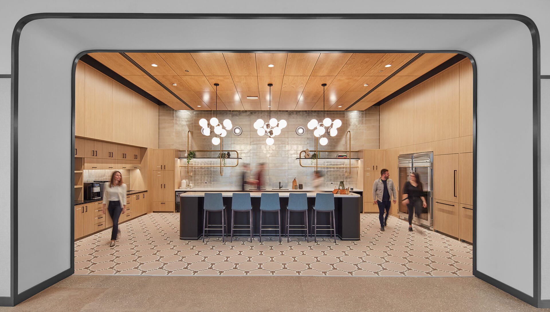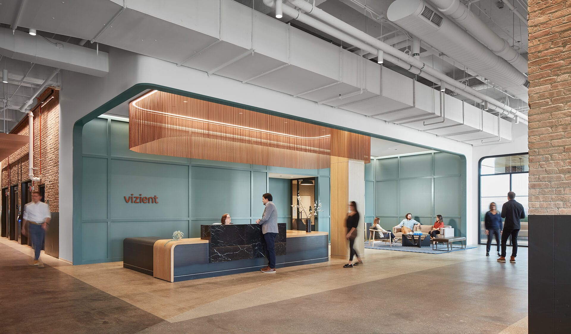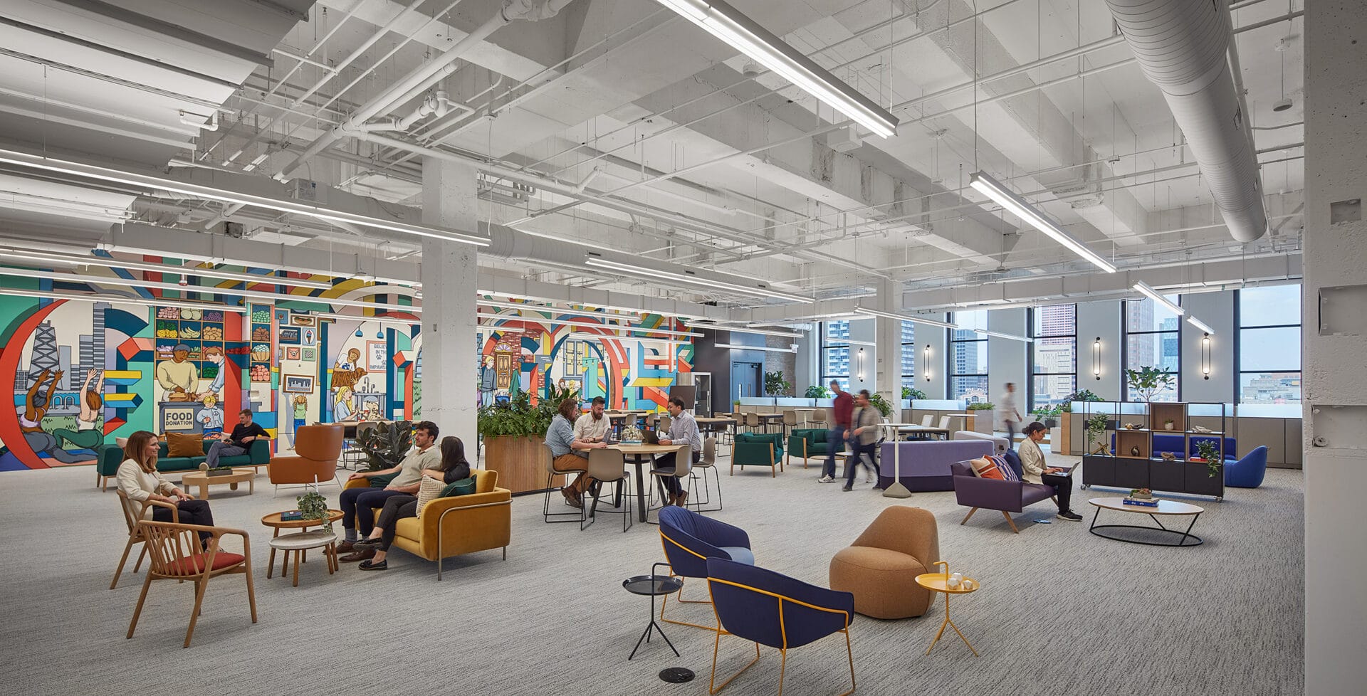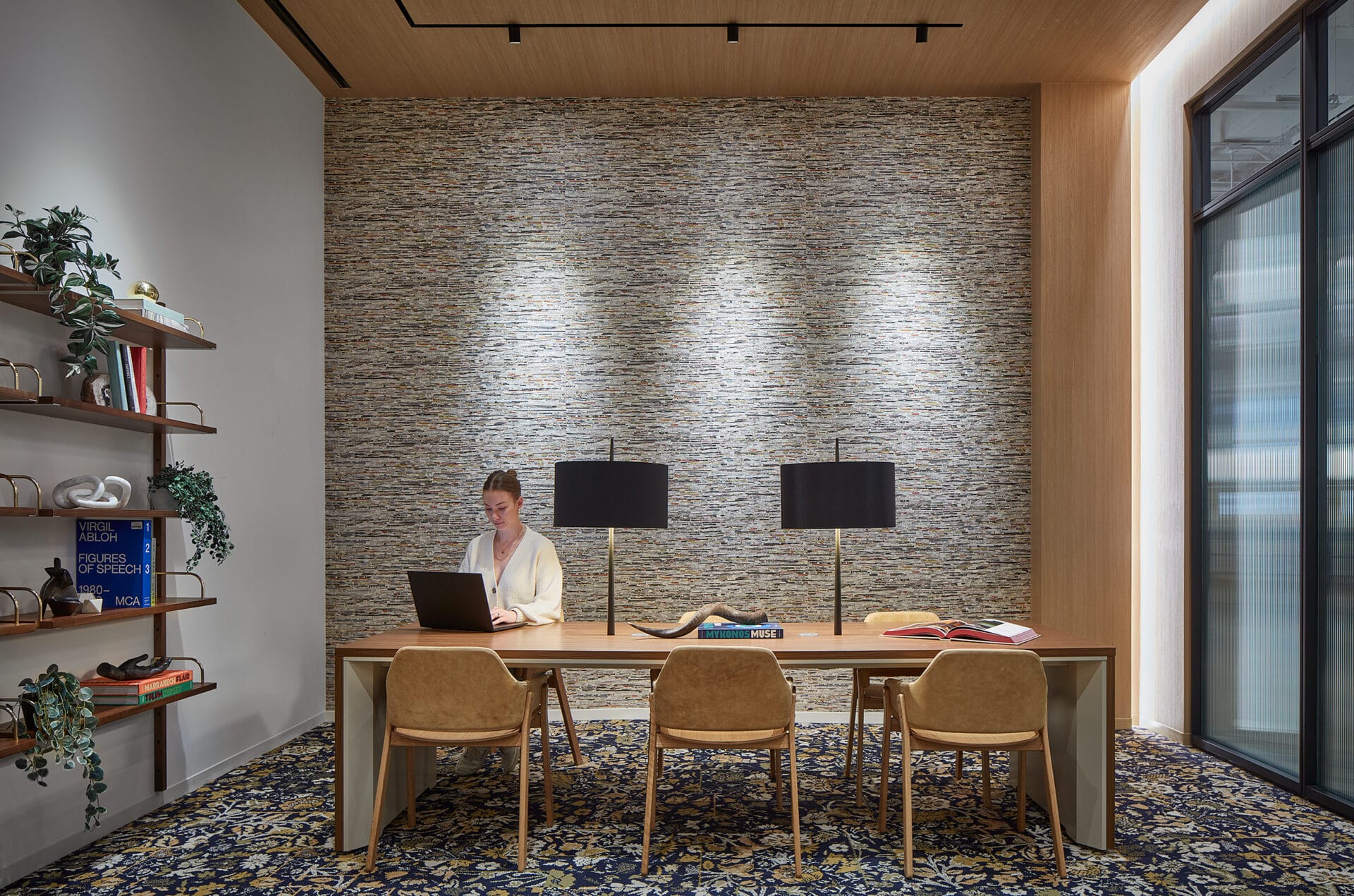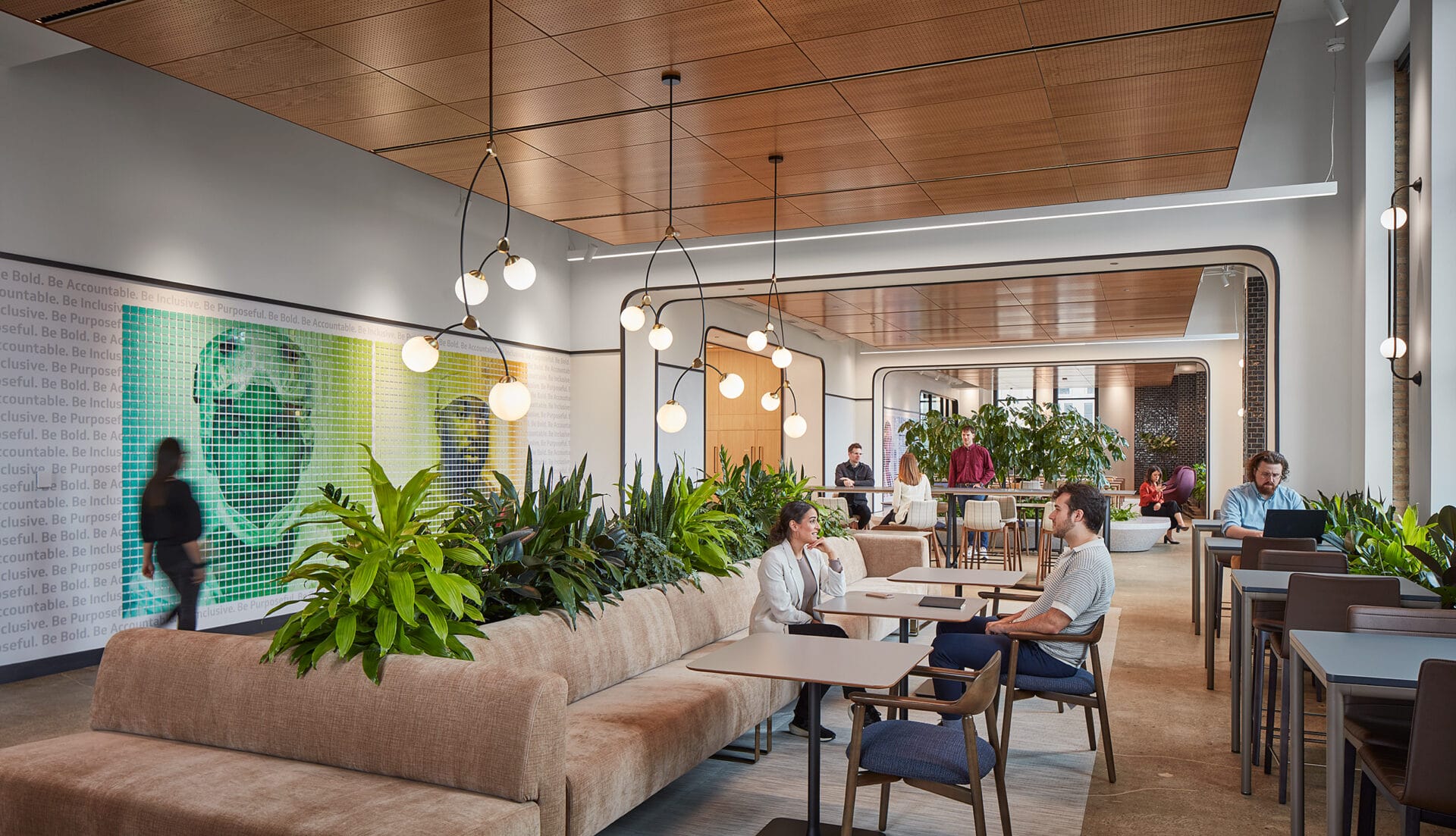 The new office interior is located in the historic Old Post Office and is designed with a “City and Parks” theme, incorporating a variety of building material finishes, extensive greenery, millwork elements reminiscent of tree canopies, park benches and café seating.